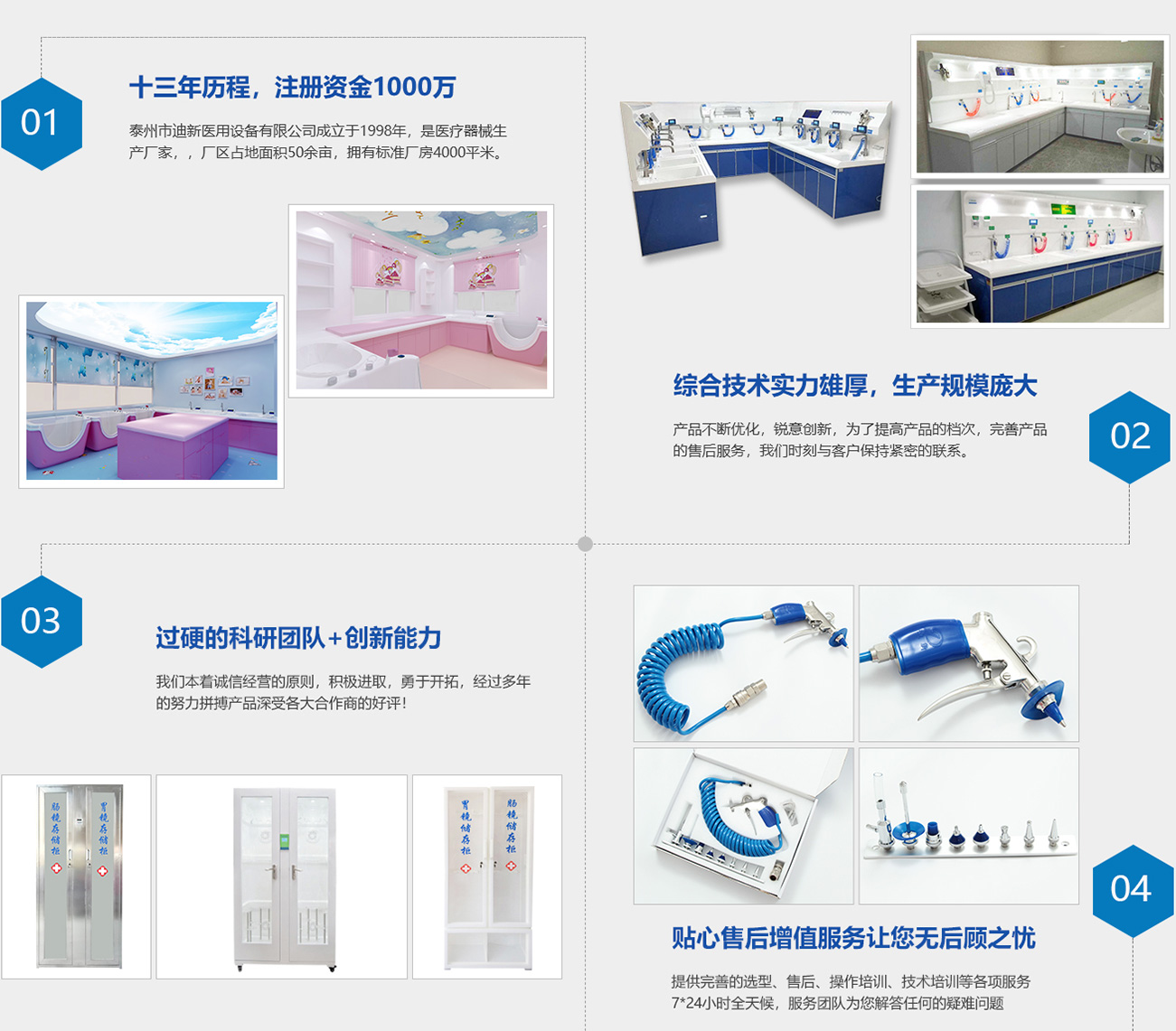 泰州市迪新醫(yī)用設(shè)備有限公司成立于1998年,是醫(yī)療器械生產(chǎn)廠(chǎng)家。公司坐落于江蘇省泰州市新區(qū),廠(chǎng)區(qū)占地面積50余畝,擁有標(biāo)準(zhǔn)廠(chǎng)房4000平米。公司在職各類(lèi)高中級(jí)技術(shù)人員20余名,職工100余名。我公司是以生產(chǎn)內(nèi)窺鏡清洗工作站、內(nèi)鏡清洗槽、內(nèi)窺鏡儲(chǔ)存柜、超聲波清洗器、高壓水槍、電腦吹干機(jī)等為主導(dǎo)產(chǎn)品醫(yī)療器械生產(chǎn)廠(chǎng)家。公司有多年生產(chǎn)設(shè)備的經(jīng)驗(yàn),實(shí)力雄厚,擁有研發(fā)高新產(chǎn)品的能力,完善的加工設(shè)備和齊全的檢測(cè)手段。公司生產(chǎn)的內(nèi)窺鏡清洗工作站經(jīng)上海長(zhǎng)海醫(yī)院、瑞金醫(yī)院、仁濟(jì)醫(yī)院、浙醫(yī)附院、湖南醫(yī)大附屬湘雅醫(yī)院、江蘇省人民醫(yī)院等一大批內(nèi)窺鏡專(zhuān)家使用后一致認(rèn)可,被推廣應(yīng)用。多年來(lái),企業(yè)不斷開(kāi)拓創(chuàng)新,競(jìng)爭(zhēng)拼搏,本著“精心制造、誠(chéng)心服務(wù)、低價(jià)銷(xiāo)售、重守合同、送貨快捷”的宗旨,贏(yíng)得了廣大消費(fèi)者的認(rèn)可。誠(chéng)實(shí)守信、共贏(yíng)進(jìn)取是每個(gè)迪新人的精神基石,我們熱誠(chéng)期盼與各企事業(yè)單位合作俱進(jìn),共創(chuàng)輝煌。現(xiàn)我公司誠(chéng)招各省市地區(qū)代理商。歡迎各家醫(yī)院來(lái)電來(lái)函洽談!